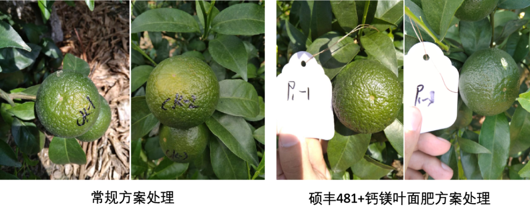 在雜柑的幼果膨大期使用天然蕓苔素+鈣鎂葉面肥能夠促進樹體補充鈣元素,果面光靚,減少裂果產生,預防日灼果。小編推薦:雜柑幼果膨大期,使用天然蕓苔素碩豐481?2000倍+多迎鈣鎂1000倍噴霧。與常規(guī)方案處理相比,此方案處理,果實直徑大、果面光亮,日灼果發(fā)生概率降低30%。